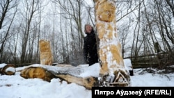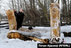 Народны майстар, аўтар драўляных скульптур Іван Супрунчык зь вёскі Цярэблічы на Століншчыне робіць помнік габрэям, расстраляным у 1942 годзе ва ўрочышчы Хабішчы пад Альшанамі.