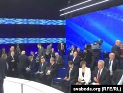 На сустрэчу з Аляксандрам Лукашэнкам сабралася каля 300 чалавек, у тым ліку журналісты, дэпутаты, міністры, экспэрты, прадстаўнікі грамадзкіх арганізацый, сьвятары розных канфэсій.