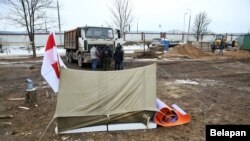 А 8-й ранку, калі рабочых яшчэ не было на аб’екце, Дашкевіч з паплечнікамі ўсталявалі намёт і прымацавалі да яго нацыянальны сьцяг. Але неўзабаве прыйшлі рабочыя, завязаўся канфлікт з пратэстоўцамі.
