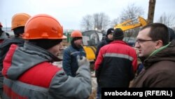 Жыхары гутараць з актывістамі, спрачаюцца з рабочымі. Дашкевіч у пакамечанай куртцы і з брудам на твары ўсьміхаецца: