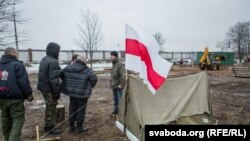 Актывісты «Маладога Фронту», якіх будаўнікі ўчора гвалтоўна выдалілі з будаўнічай пляцоўкі ля мэмарыяльнага комплексу «Курапаты», паставілі намёт побач з будоўляй, запалілі агонь у бочцы. Яны прастаялі ноч, працягваюць стаяць удзень.