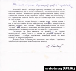 Але ў маладых людзей Беларусі — сьвежы розум і добрая памяць, і яны ім ня здраджваюць. Што ж да Курапатаў, дык вы іх зьбераглі цягам завейных месяцаў, праз сьцюжу і тэрор праваразбуральных ды іншых „органаў“. Вы абаранілі, можа, самы жахлівы краёчак нашай гісторыі — памяць пра зло і крывавае злачынства, што чыніліся супраць нацыі.