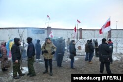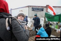 Абаронцы Курапатаў блякуюць будаўнічую тэхніку сабой. Курапаты, 24 лютага. Фотарэпартаж: