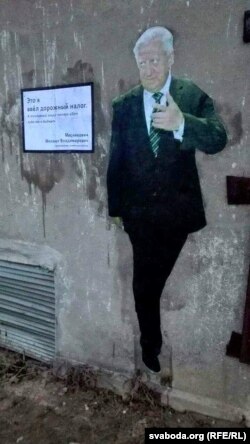 Карыкатура зьвілася на адным з будынкаў на вуліцы Дружнай. Старшыня Савету Рэспублікі Беларусь Міхаіл Мясьніковіч намаляваны ў поўны рост, побач надпіс: «Гэта я ўвёў дарожны падатак». Дарожны падатак быў уведзены падчас таго, як Міхаіл Мясьніковіч займаў пасаду прэм’ер-міністра Рэспублікі Беларусь.
