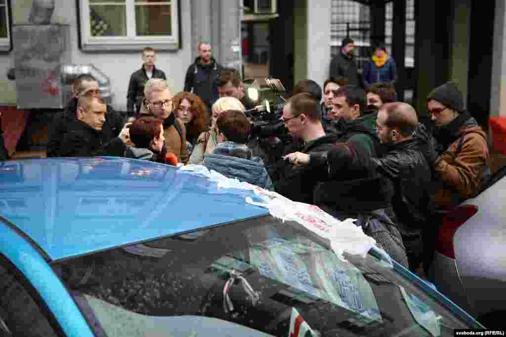 У Менску затрымалі аднаго зь лідэраў «Маладога фронту» Зьмітра Дашкевіча, Арцёма Леўчанку і Сяргея Пальчэўскага. Жонка Зьмітра Наста Палажанка склікала прэсавую канфэрэцыю ў двары каля разьбітай падчас затрыманьня машыны.