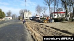 Далей па вуліцы Кастрычніцкай раўнуюць рыдлёўкамі асфальтную крошку дарожнікі з Буда-Кашалёва. Соўгаецца дарожная тэхніка ДРБУ-184.