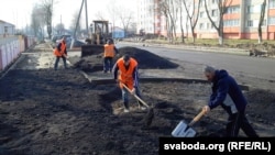 «Нам загадалі завяршыць усе вулічныя работы да 20 красавіка», — тлумачыць Аляксандар, дарожнік з Рэчыцы. Разам зь іншымі рэчыцкімі работнікамі ён парадкуе асфальт дарожнага кола на скрыжаваньні вуліц Кастрычніцкая і Батракова.