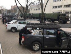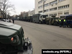 На паркоўцы ля НАН Беларусі знаходзяцца 3 вялікія аўтазакі МАЗ, далей на той жа вуліцы Акадэмічнай, мэтраў за 100 ўглыб ад праспэкту Незалежнасьці, прыпаркавана 12 аўтазакаў, машын для перавозкі затрыманых.