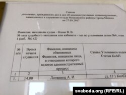 «На вуліцы Касманаўтаў 23 сакавіка нецэнзурна лаяўся», — зачытвае пратакол судзьдзя Казак. Лагвінец аспрэчвае: ён ішоў з сынам, на іх накінуліся невядомыя, выглядалі і паводзілі сябе як бандыты.