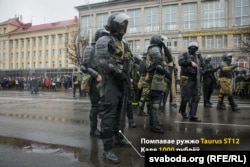 У помпавай стрэльбы, зь якой стаяў амапавец, была яшчэ насадка. Хутчэй за ўсё, яна прызначаная для газавых гранат. Гэта можа пацьвердзіць і поза сілавіка, які трымаў стрэльбу руляй дагары. Астатнія амапаўцы трымалі свае драбавікі руляй долу.