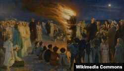 Пэдэр Сэвэрын Крэер, «Купальскае вогнішча на пляжы ў Скагене» (1906); Peder Severin Krøyer, «Sankt Hansblus på Skagen strand»