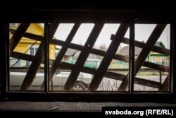 Вокны ў хаце Алега Бірукова цяпер забітыя дошкамі. Звонку сьлядоў пажару амаль не відаць. Але калі зайсьці ўсярэдзіну, зразумела, што жыць тут немагчыма.