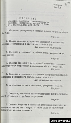 ПЕРЕЧЕНЬ сведений, подлежащих засекречиванию по вопросам, связанным с аварией на блоке № 4 Чернобыльской АЭС (ЧАЭС).