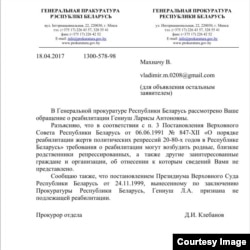 Ліст за подпісам пракурора аддзелу Клябанава дайшоў зь вялікай затрымкай і канстатуе: (цытата) «Геніюш Л.А. прызнана не падлеглай рэабілітацыі».