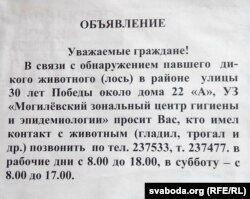 Пра ўтылізацыю жывёліны і яе хваробу паведаміў галоўны дзяржаўны санітарны ўрач Магілёва і Магілёўскага раёну Вячаслаў Шуляк. Паводле яго, абвесткі на вуліцы 30 гадоў Перамогі расклееныя ў межах санітарна-эпідэміялягічных захадаў.