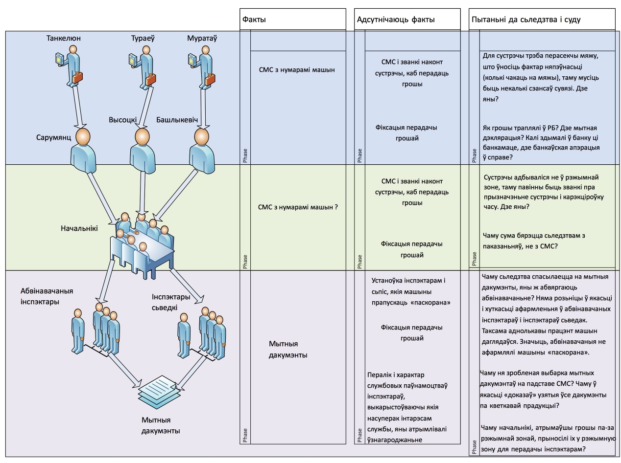 Цяпер схему, прапанаваную сьледчымі КДБ, нельга разглядаць у адрыве ад матэрыялаў працэсу і простае лёгікі, якой не паддаюцца прызнальныя паказаньні мытнікаў, аднолькавыя як у частцы кадэбэшнай фабулы, так і ў пытаньнях па-за ёй («ня помню», «не магу знаць», «ня ведаю»). Затое паддаюцца простай лёгіцы паказаньні тых, хто віны не прызнаў – як у частцы адмаўленьня хабару, так і ў частцы пямяці. Гэтыя памятаюць і ведаюць усё, бо ня маюць фабулы і ўсе паказаньні супраць сябе адназначна разглядаюць як агавор.