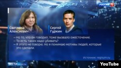Увечары 25 чэрвеня на тэлеканале «Россия 1» у чарговым выпуску штотыднёвай перадачы «Весткі тыдня зь Дзьмітрыем Кісялёвым» 5% эфірнага часу было прысьвечана беларускай нобэлеўскай ляўрэатцы Сьвятлане Алексіевіч.