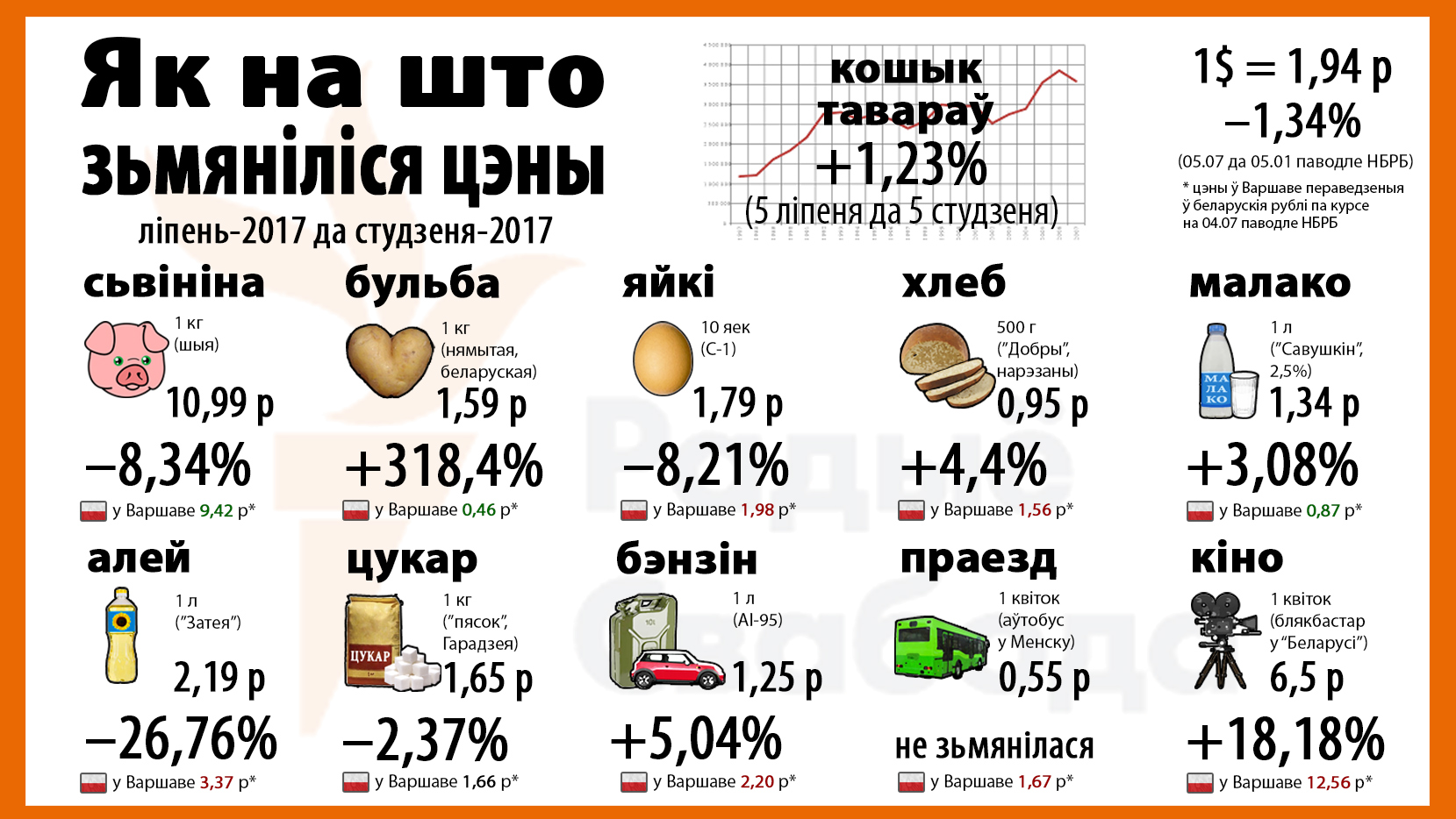 Як ні дзіўна, але найбольшая розьніца ў цане — на маладую бульбу. У беларускай краме яна каштуе ў 3,5 раза даражэй. Гэта пры тым, што ў нас бульба прадаецца беларуская, а ў польскай краме — грэцкая. У сваю чаргу, квіток на праезд у грамадзкім транспарце ў тры разы даражэйшы ў Варшаве, чым у Менску.