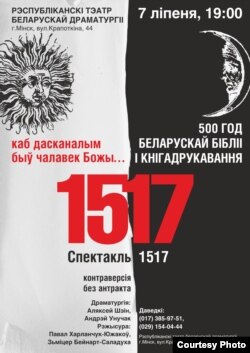 7 ліпеня ў Рэспубліканскім тэатры беларускай драматургіі адбудзецца перадпрэмʼерны паказ спэктакля «1517», прымеркаванага да 500-годзьдзя беларускай Бібліі і кнігадрукаваньня. Гэта не біяграфічны спэктакль пра выбітнага беларускага гуманіста і асьветніка Францішка Скарыну. Гэта спроба асэнсаваць, чаму Скарына, які быў доктарам лекарскіх навук, зьмяніў свае жыцьцёвыя пляны, стаў перакладчыкам Бібліі і пачынальнікам беларускага кнігадрукаваньня, чаму адбылася такая трансфармацыя.