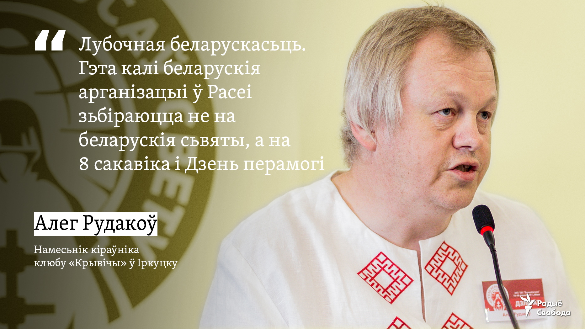 «Куды падзеліся беларусы, якіх у нашым рэгіёне ў 1913 годзе было 300 тысяч? У 1989 годзе іх было 50 тысяч, а ў 2012 годзе — 16 тысяч. Чаму нашчадкі перасяленцаў не запісваюцца згодна сваёй нацыянальнасьці? Яны губляюць сувязь з гістарычнай радзімай. Больш за тое, нашых беларусаў і раней і цяпер як толькі не называлі. То літоўцамі, бо калісьці была так званая „служылая Літва“ ў Сыбіру, то палякамі, бо ўсіх удзельнікаў паўстаньня Кастуся Каліноўскага ў нас у Сыбіру называюць палякамі, то ўкраінцамі, бо размаўляюць зь цікавым гукам „г“, то, безумоўна, рускімі з Заходняга краю».