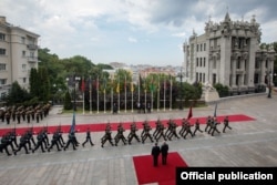 У Кіеве на плошчы перад будынкам Адміністрацыі ўкраінскага прэзыдэнта праходзіць афіцыйная цырымонія сустрэчы кіраўнікоў Беларусі і Ўкраіны Аляксандра Лукашэнкі ды Пятра Парашэнкі.