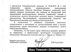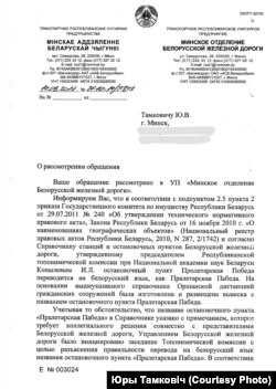 Днямі Юры Тамковіч атрымаў адказ з подпісам першага намесьніка начальніка менскага аддзяленьня Беларускай чыгункі Віктара Ціхановіча.