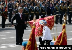 Падчас параду Пятро Парашэнка ўручыў зоркі Героя Ўкраіны, у тым ліку маці і сыну загінулага афіцэра.