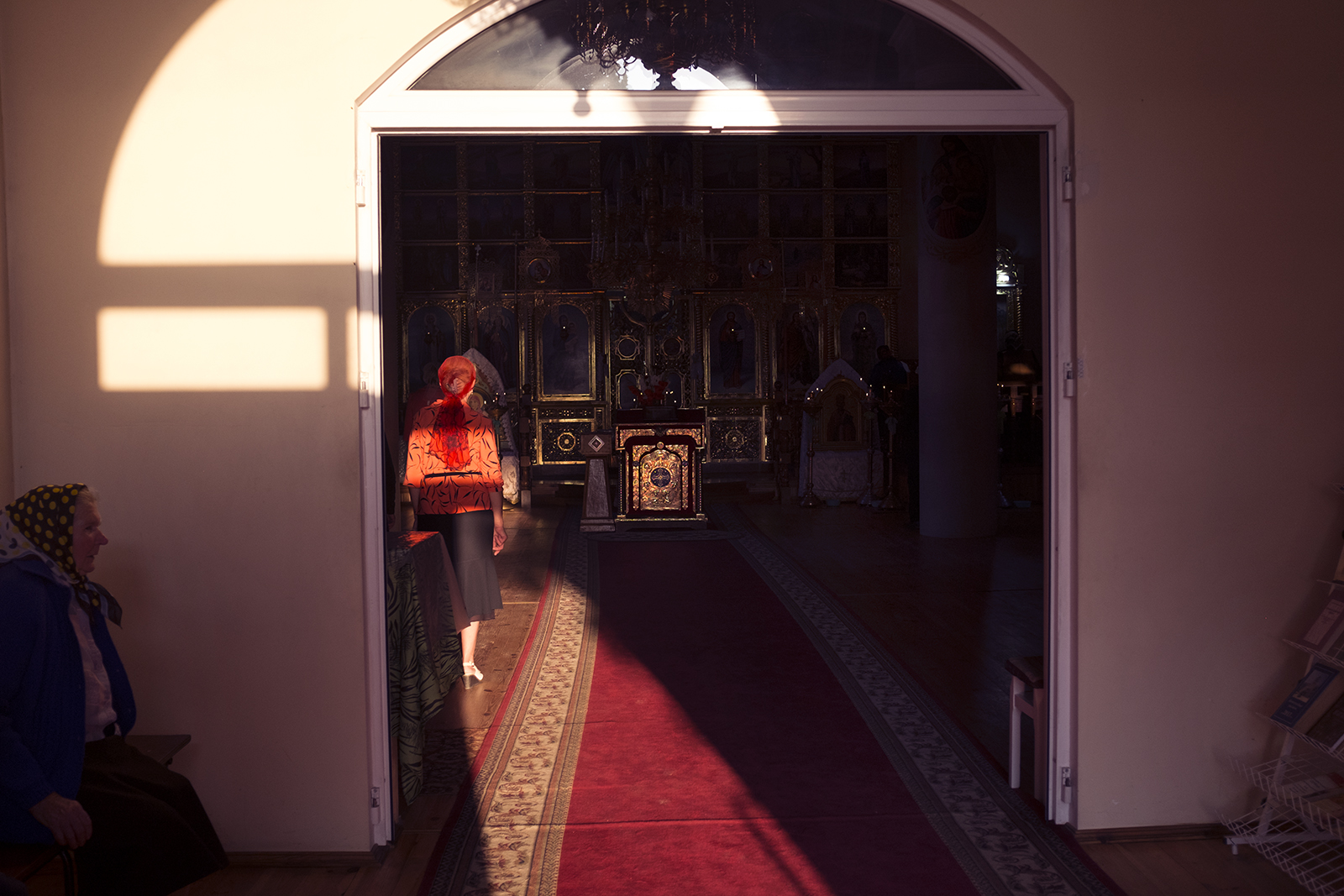 Мы пакідаем пратэстанцкае набажэнства, каб пасьпець параўнаць яго з праваслаўным. Але ў суседняй царкве моляцца толькі восем пажылых жанчын, сярод якіх Праскоўя. Яна пазнала нас і ўсьміхнулася.