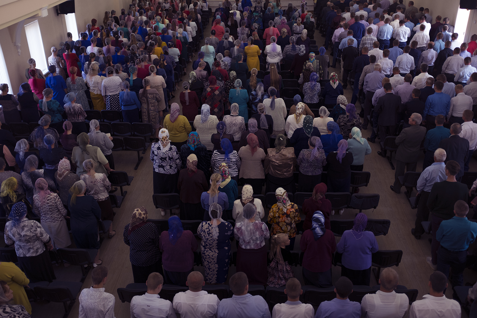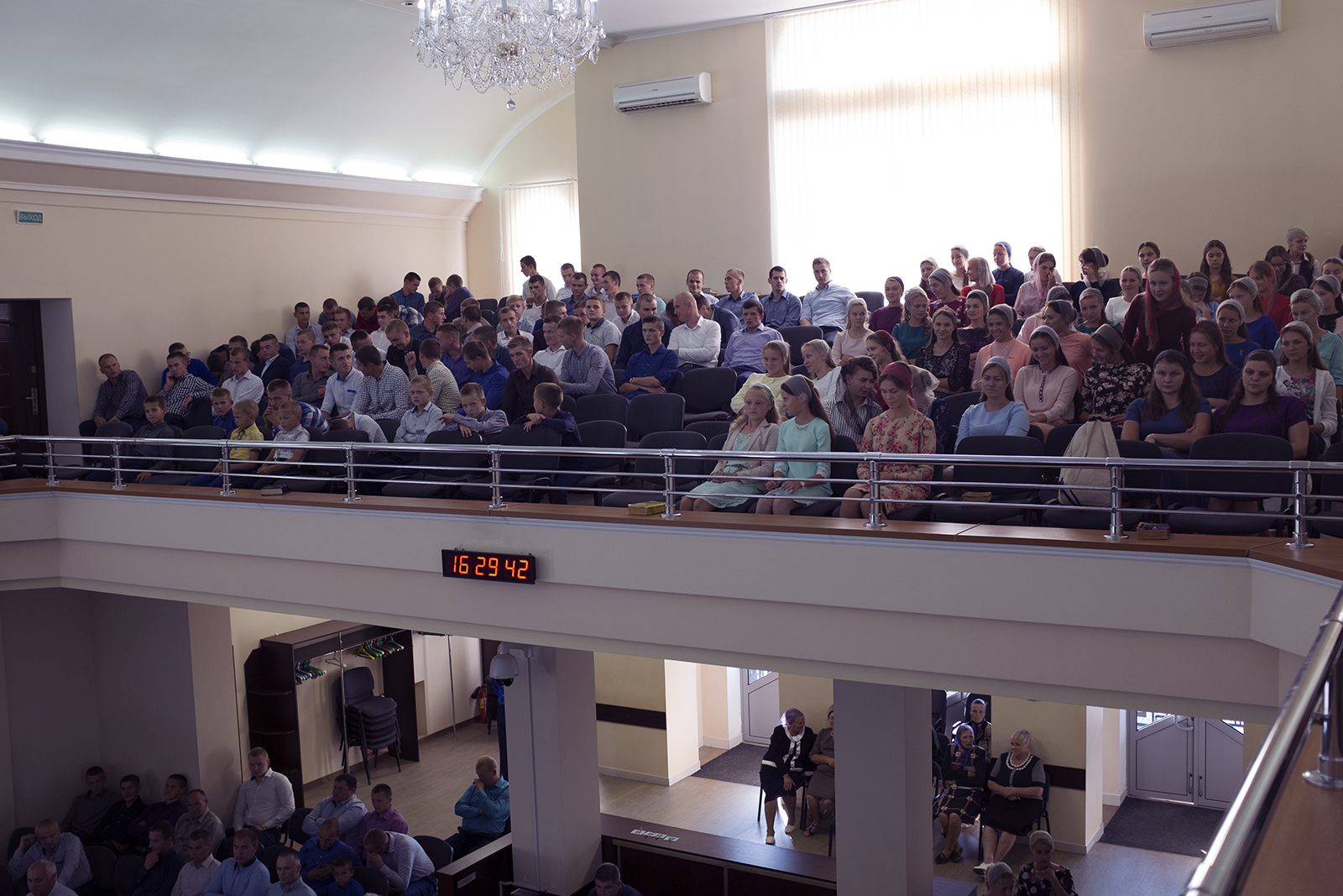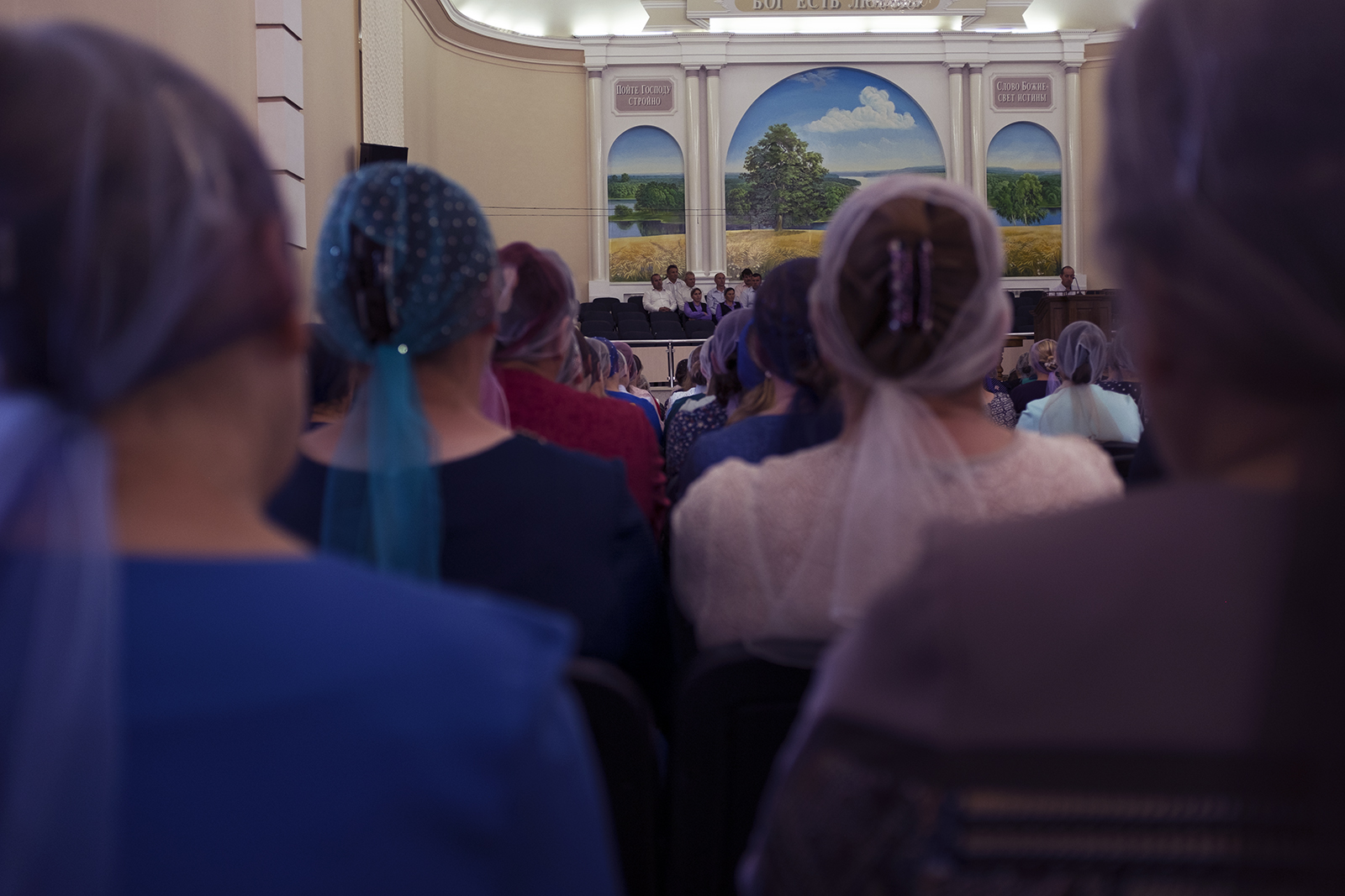 Адразу заўважныя два адрозьненьні ад менскіх пратэстанцкіх цэркваў: жанчыны хаваюць валасы пад хусткі ды сядзяць асобна ад мужчынаў — у левай частцы, як унізе, так і на бальконе.