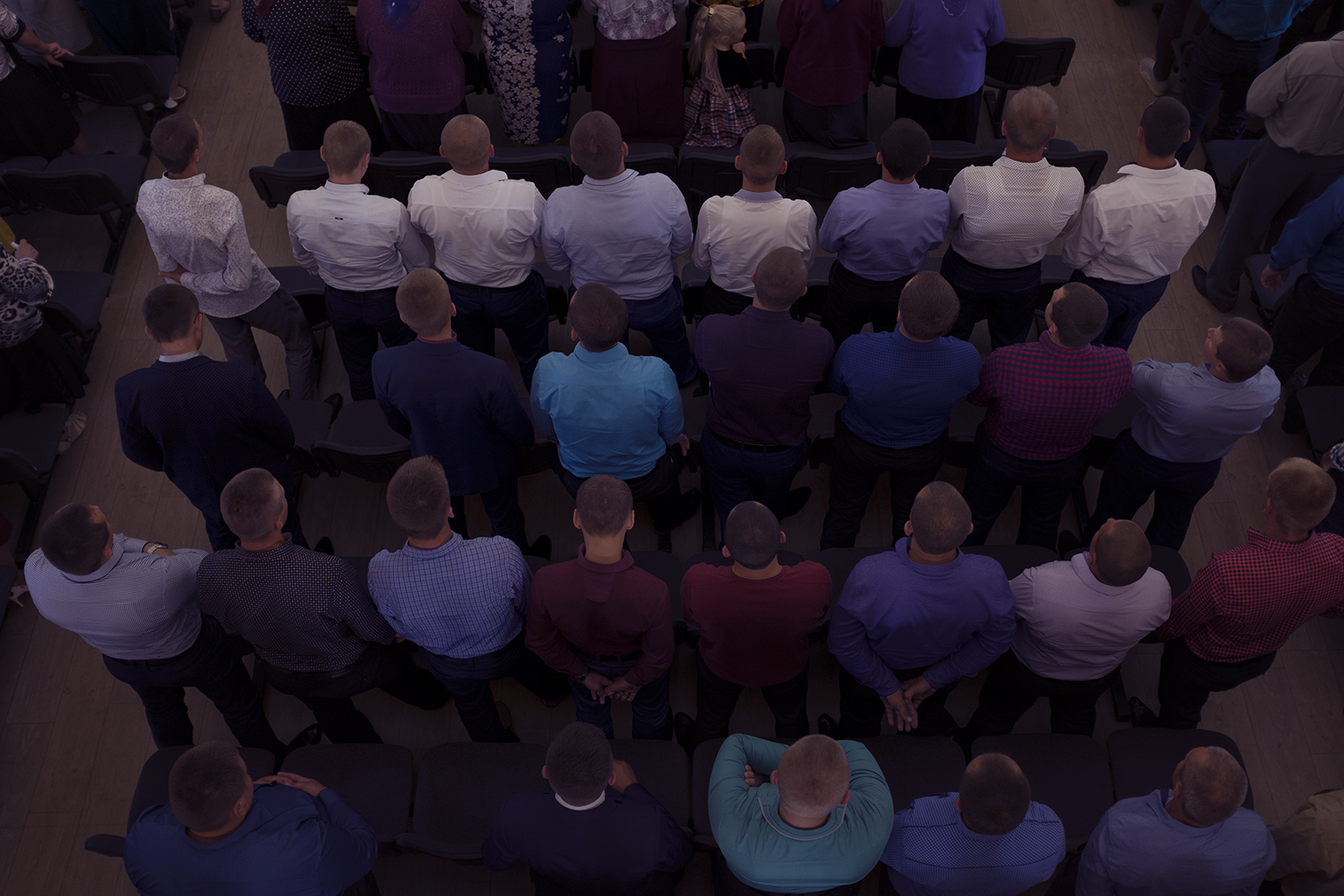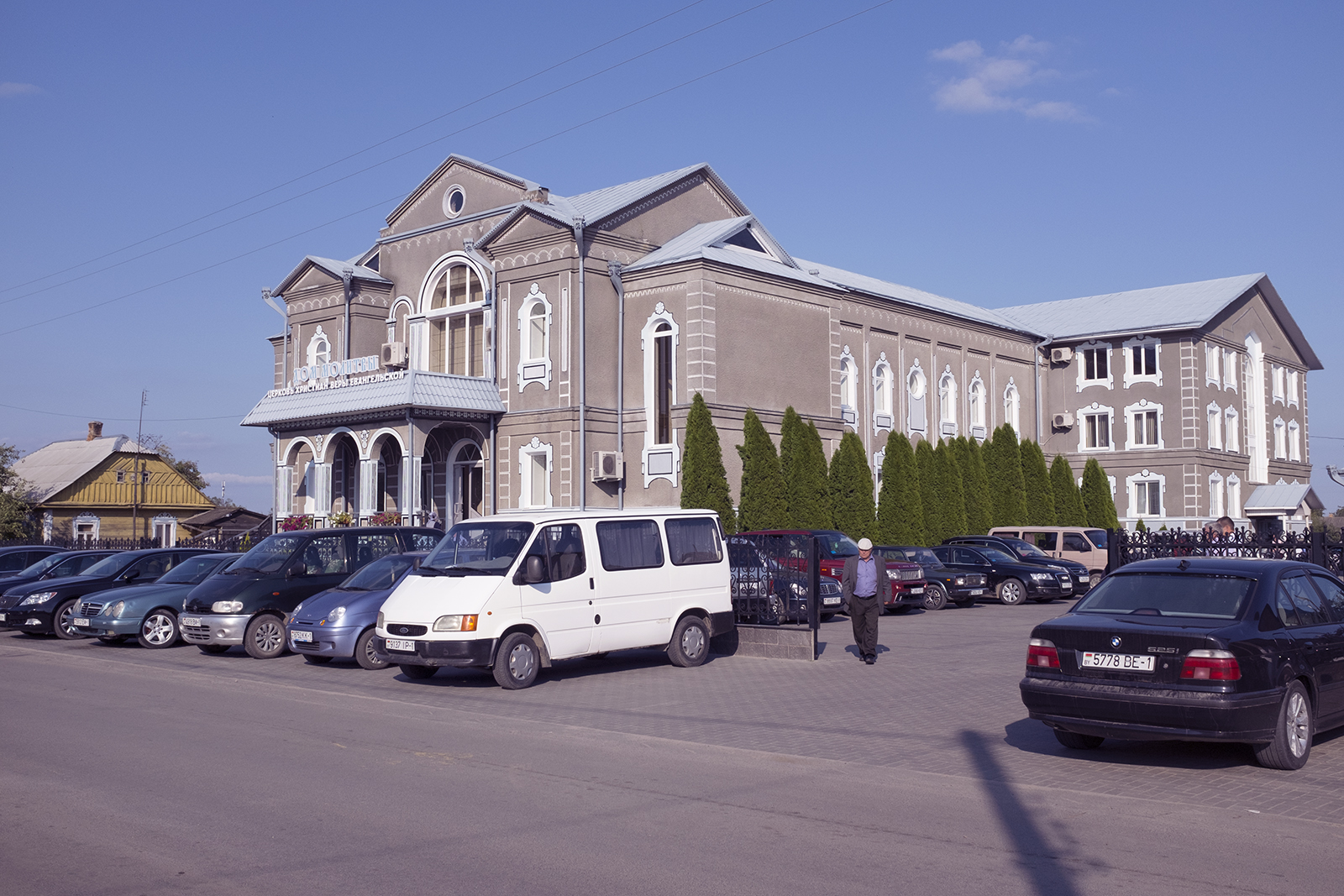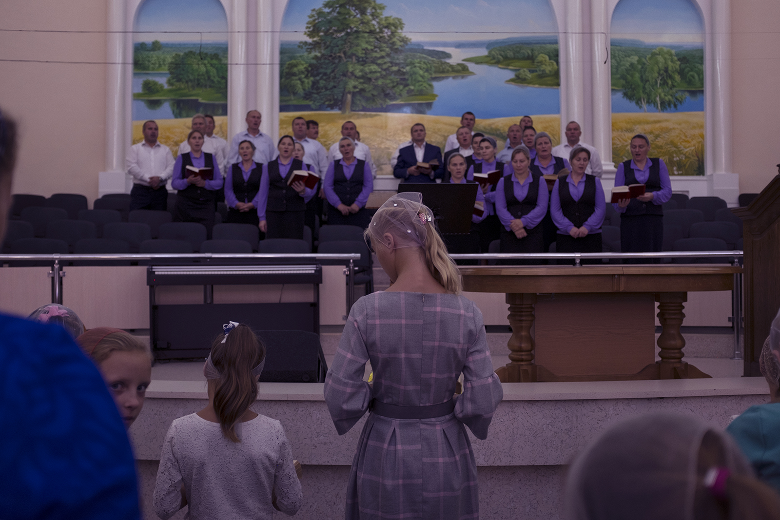 Адразу заўважныя два адрозьненьні ад менскіх пратэстанцкіх цэркваў: жанчыны хаваюць валасы пад хусткі ды сядзяць асобна ад мужчынаў — у левай частцы, як унізе, так і на бальконе.