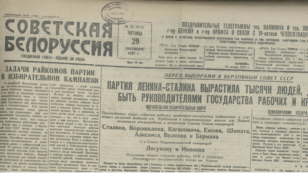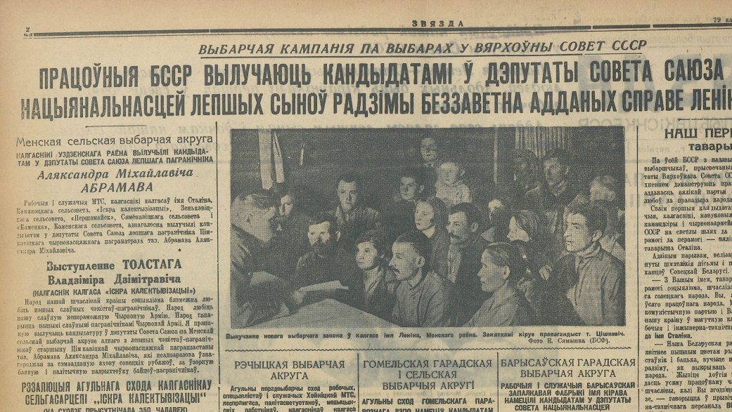 «Працоўныя БССР вылучаюць кандыдатамі ў дэпутаты Совета Саюза і Совета Нацыянальнасцей лепшых сыноў Радзімы беззаветна адданых справе Леніна-Сталіна», — піша газэта.