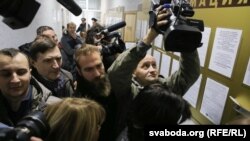 Супрацоўнікі суду прымусілі журналістаў і назіральнікаў за працэсам пакінуць залю, каб міліцыя магла агледзець памяшканьне.