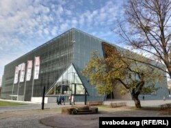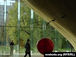 Адна сьцяна музэю зь вялізарным вакном глядзіць на помнік героям варшаўскага гета.