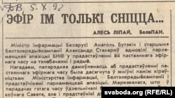 У тым самым 1992 годзе на даручэньне Апазыцыі БНФ я распрацаваў Канцэпцыю інфармацыйнай палітыкі, якая базавалася на прынцыпах свабоды прэсы, акцыянаваньні выданьняў і дзяржаўнай падтрымцы беларускамоўных СМІ.