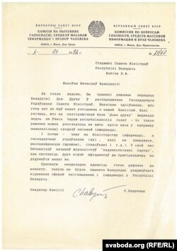 Празь некалькі дзён на тры адрасы — Вярхоўнаму Савету, Савету Міністраў і мне як дэпутату — прыйшоў адказ, падпісаны міністрам інфармацыі Анатолем Бутэвічам.