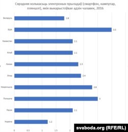 Што тычыцца сярэдняй колькасьці электронных прыладаў, якімі карыстаюцца беларусы, то паводле гэтага паказьніку яны ізноў жа апярэджваюць украінцаў, але саступаюць іншым, хаця расейцам, кітайцам і казахстанцам і ненашмат.
