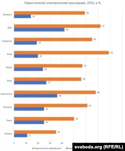 Гірархія краінаў паводле выкарыстаньня электронных прыладаў больш складаная і менш відавочная. У Беларусі адносна малая доля выкарыстаньня пляншэтаў, але даволі высокі адсотак тых, хто карыстаецца смартфонамі, ён вышэй, чым ва Ўкраіне, Літве, Латвіі і Расеі і знаходзіцца ўзроўні Польшчы. Цікава, што «смартфоннымі» чэмпіёнамі аказаліся кітайцы, апярэдзіўшы нават амэрыканцаў.