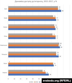 Дасьледаваньні Connected Consumer Survey у 2017 годзе ў Беларусі ці не праводзіліся ці не былі абнародаваныя. Аднак уяўляе інтарэс, як мяняецца ангажаванасьць у інтэрнэт тых краінаў, па якіх дадзеныя ёсьць. Графік, які пададзены ніжэй, паказвае, што літаральна за год-другі ў самых розных краінах назіраўся заўважальны рост аўдыторыі інтэрнэту, за два гады яна вырасла на 4 адсоткавых пункты ў Польшчы, на 5 пунктаў — у Літве, ЗША і Кітаі, на 10 — ва Ўкраіне.