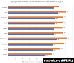 Паводле ўзроўню доступу да інтэрнэту Беларусь — зусім не аўтсайдэр, яна — паміж Украінай і Расеяй, хаця не нашмат адстае ад Латвіі, Літвы і Казахстану. Паводле долі штодзённых карыстальнікаў інтэрнэтам краіна знаходзіцца прыкладна на ўзроўні ўсіх суседзяў, акрамя Ўкраіны, апярэджваючы яе. Адстае Беларусь ад сусьветных лідэраў — Нямеччыны і ЗША, аднак гэтае адставаньне не такое і істотнае.