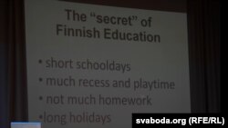 Пра гэта 18 студзеня ў Менску распавядаў Кары Лоўхівуоры — былы дырэктар школы, дзе вучні ходзяць без абутку, не здаюць тэстаў, а настаўнікі ствараюць уласную праграму навучаньня.