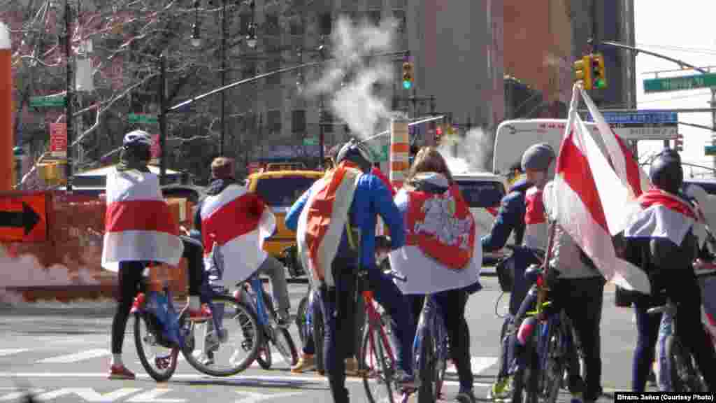Беларусы Нью-Ёрку правялі 11 сакавіка роварны парад зь бел-чырвона-белымі сьцягамі па Мангэтане. Акцыя была прысьвечаная 100 годзьдзю абвяшчэньня незалежнасьці Беларускай Народнай Рэспублікі. Фотаздымкі Віталя Зайкі.
