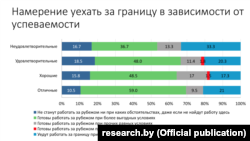 Паводле дасьледаваньня, гатовыя паехаць за мяжу і працаваць за мяжой пры больш выгадных умовах 49% рэспандэнтаў. Зьедуць працаваць за мяжу пры першай магчымасьці, нават калі праца не па спэцыяльнасьці, 19% рэспандэнтаў. Паводле Дарʼі Урбан, «гэта высокі ўзровень міграцыйных установак».