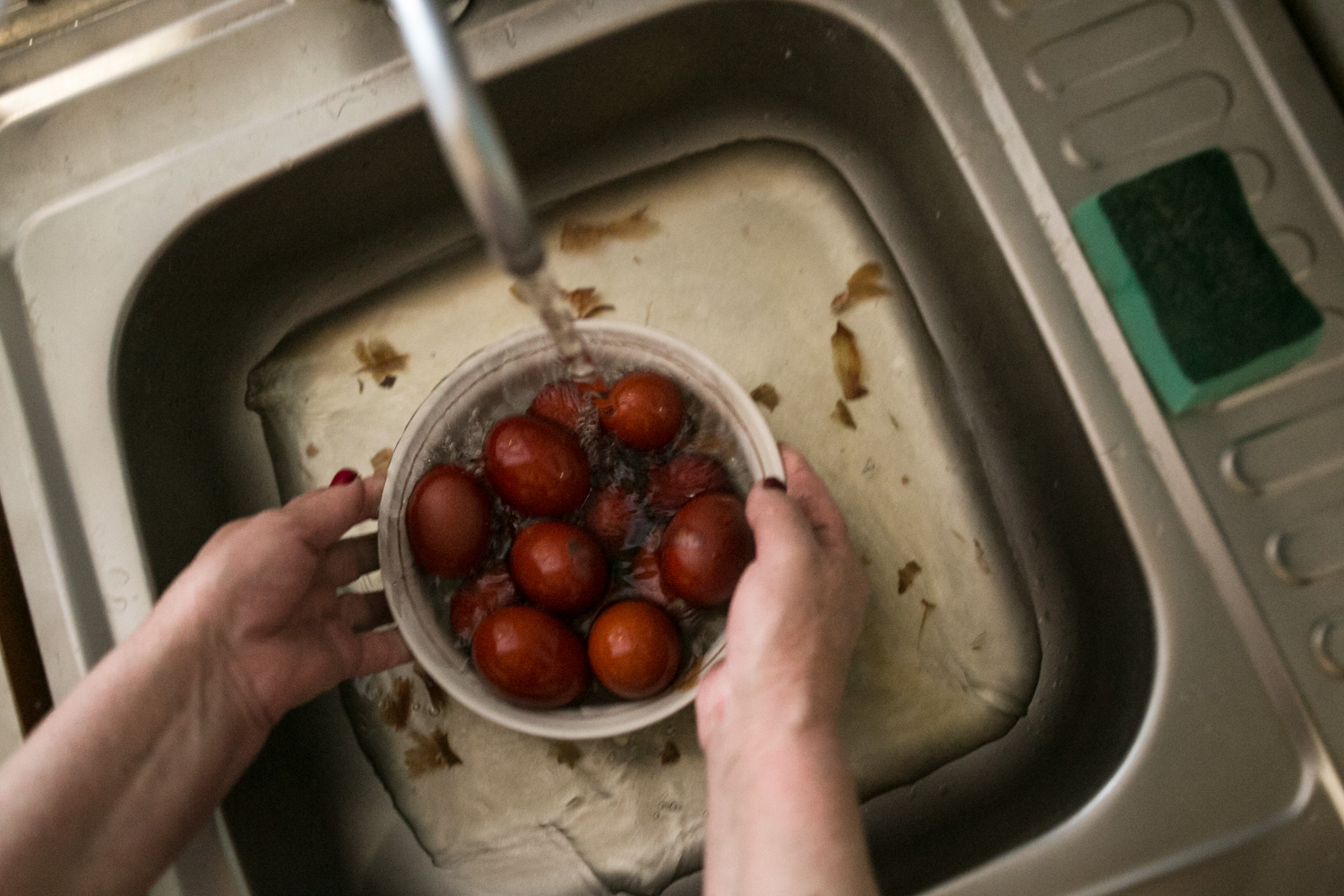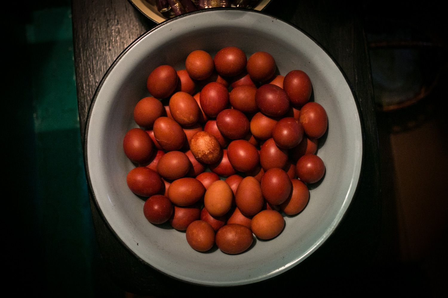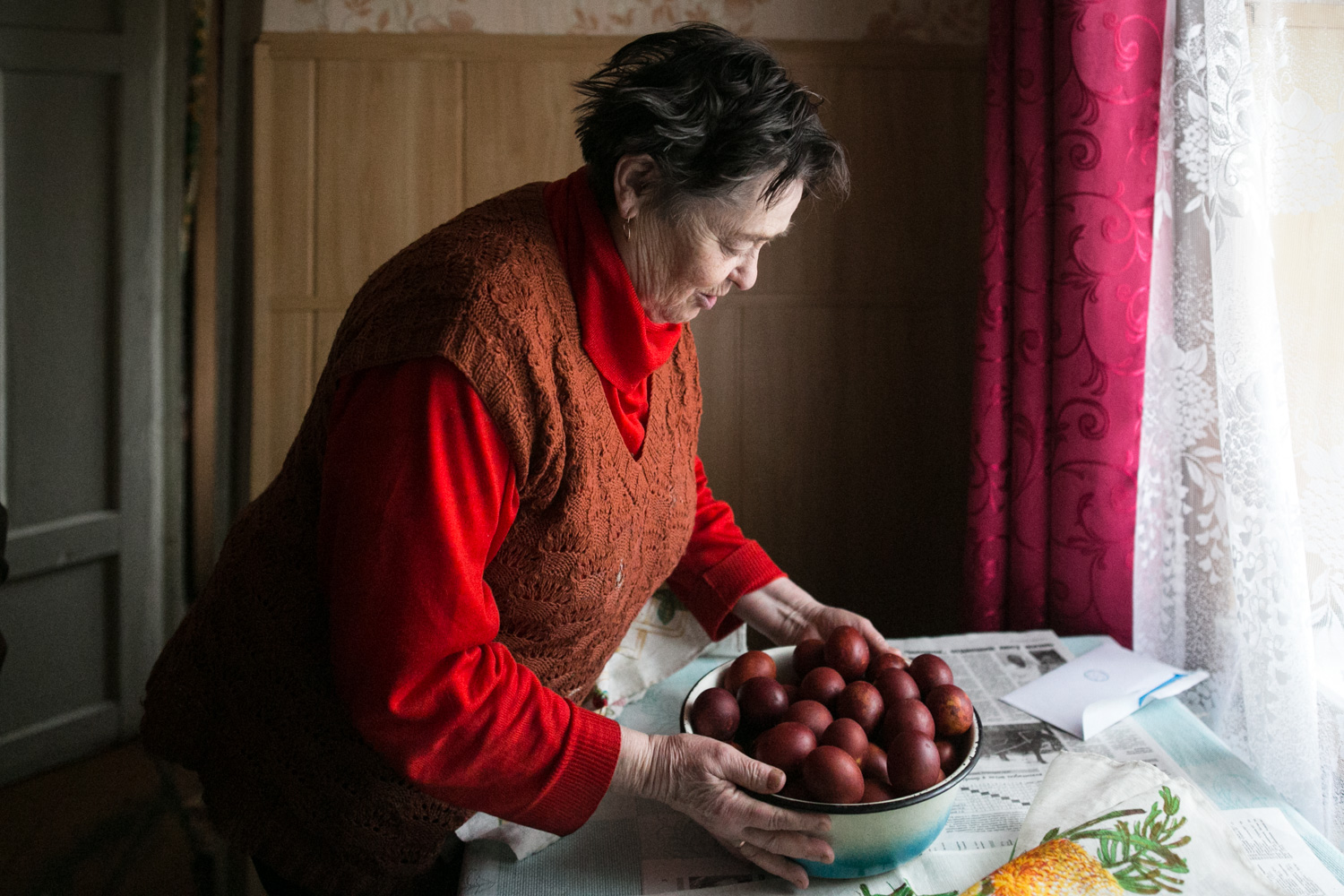 Мы наведваем Шабановіча ўвечары чацьвярга. Ягоная жонка яшчэ фарбуе яйкі ў рашчыне з лупіньня цыбулі. Яна кажа, гэта традыцыйная фарба. Яйкі досыць адварыць у вадзе з лупіньнем 10 хвілінаў, каб яны набылі чырвона-карычневы колер.