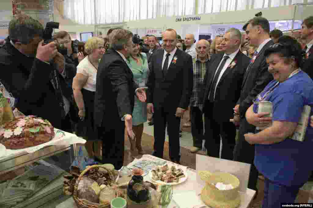 Намесьнік кіраўніка адміністрацыі Лукашэнкі Ўладзімер Жаўняк (зьлева) і міністар інфармацыі Аляксандар Карлюкевіч адкрываюць выставу