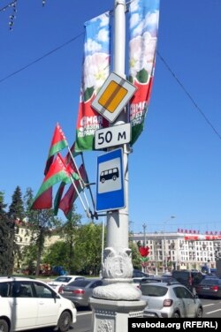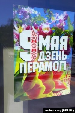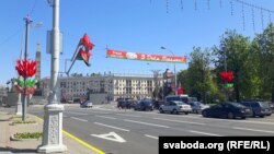 Учора назіраў, як перад сьвятам аздаблялі плошчу Перамогі ў Менску — галоўную пляцоўку, дзе 9 траўня адбываюцца асноўныя дзяржаўныя ўрачыстасьці. Колеры афармленьня толькі афіцыйныя: чырвоны, зялёны і белы. Галоўны сымбаль сьвята, прыдуманы некалькі гадоў таму — яблыневая кветка.