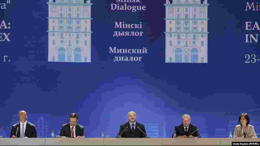 24 траўня ў межах форуму «Менскі дыялёг» кіраўнік Беларусі Аляксандар Лукашэнка выступіў з прамовай у дыскусіі «Як зрабіць Усходнюю Эўропу рэгіёнам супрацоўніцтва, а не канфрантацыі». Як гэта было вачыма фотакарэспандэнта Свабоды Ўладзя Грыдзіна.