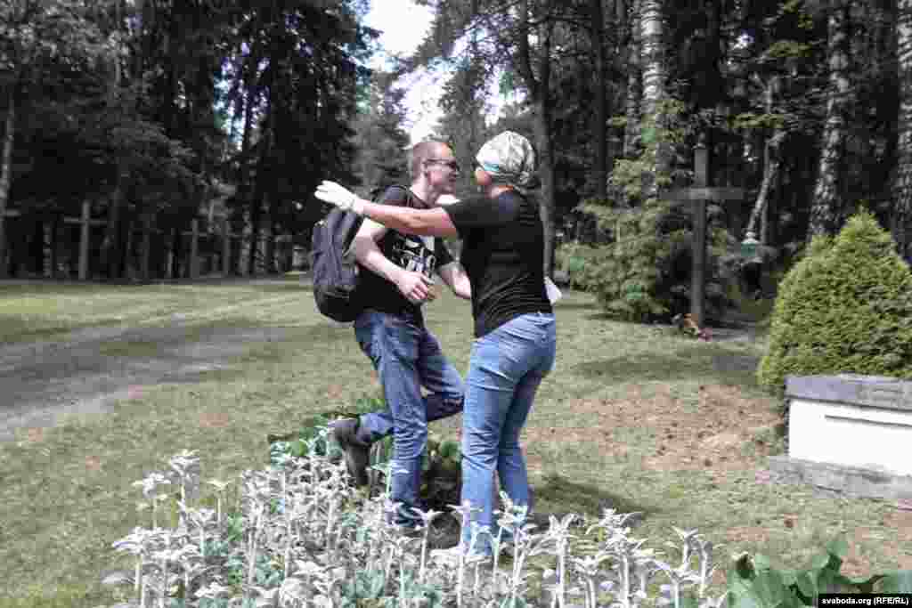 Фэрмэр Уладзімер Матусевіч, які штогод прывозіць у Курапаты кветкавую расаду, і журналіст, каардынатар ініцыятывы «Экспэрты ў абарону Курапатаў» Марат Гаравы