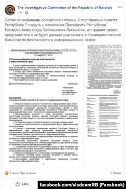 «Згодна з чаканьнямі расейскага боку, Сьледчы камітэт Рэспублікі Беларусь з дазволу прэзыдэнта Рэспублікі Беларусь Аляксандра Рыгоравіча Лукашэнкі адхіляе свайго прадстаўніка і ня будзе далей удзельнічаць у Міжведамаснай Камісіі па бясьпецы ў інфармацыйнай сфэры».