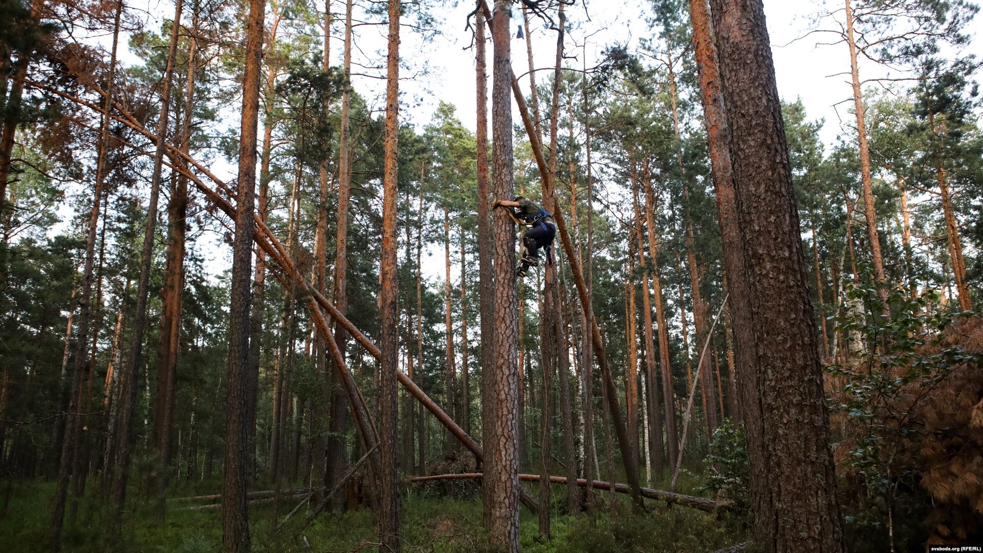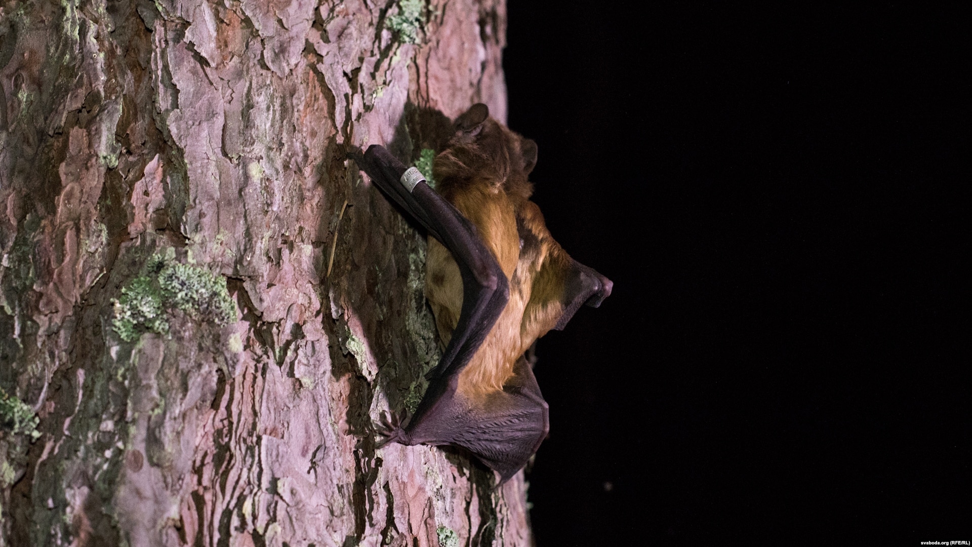 Раман Шкабара, валянтэр АПБ, са страхоўкай узлазіць на сасну, каб замацаваць на дупле самаробную плястыкавую пастку. Па чарзе з дупла вылазяць чатыры кажаны. Тры зь іх ужо былі акальцаваныя. Агулам за чатыры гады ў ваколіцах Старога Жадзена акальцавалі 11 гіганцкіх вячэрніц.