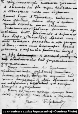 «Па Вашай просьбе намі ажыцьцяўляўся росшук Вашага сына ў Францыі. Вельмі шкадуем, росшук скончыўся беспасьпяхова. Паводле паведамленьня Францускага Чырвонага Крыжа месца жыхарства і лёс Браніслава Атрашкевіча выявіць не ўдалося».